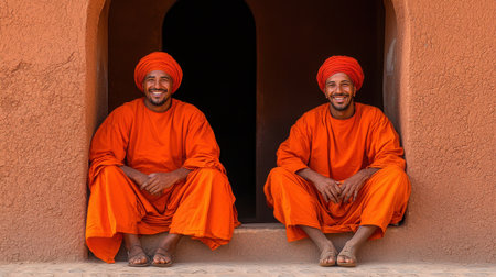 Two smiling monks in bright orange robes sit peacefully at an archway. Their relaxed posture showcases camaraderie and cultural richness in a serene outdoor setting.