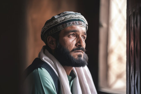 Portrait of a handsome bearded man in a turban at home