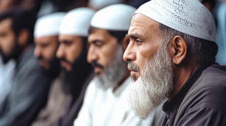 Several Muslim men sit closely together, their long beards and white skullcaps distinct against a softly blurred backdrop, exuding a sense of contemplation and community.
