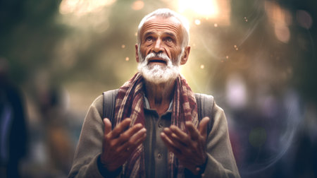 Elderly man practicing meditation outdoors at sunset, wearing a white robe, exuding peace and tranquility Background features architectural arches creating an ethereal atmosphere