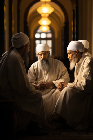 Portraying a group of Muslim scholars in white robes engrossed in a profound discussion at masjid.