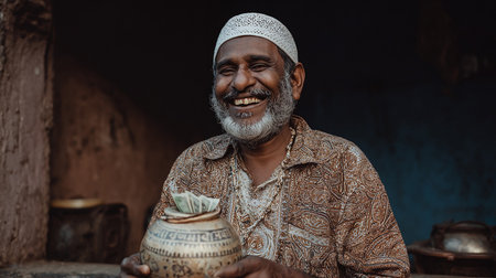 Portrait of an old Indian man holding a jar full of money