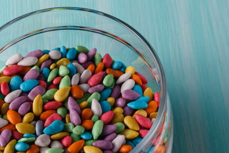 lot of colored sweet dragees in jar