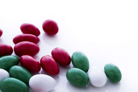 Colorful red, green and white candies on white background.