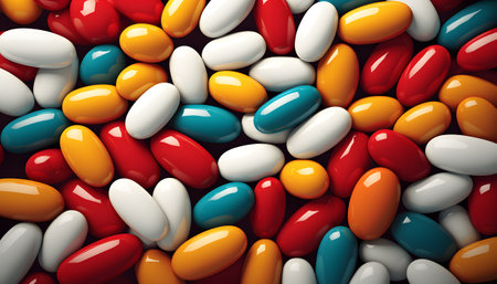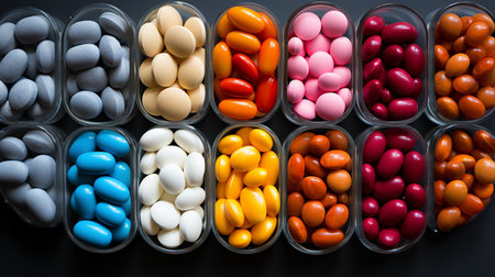 A close up of a bunch of different colored pills,.