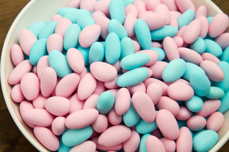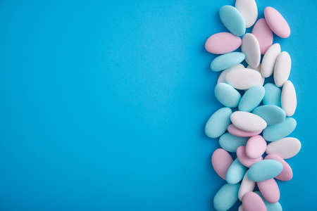 Blue, pink and white sugared almond candies like festive background
