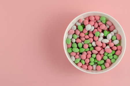 Sweet Dragee in a white bowl on a pink background. Peanuts covered with sugar glaze. White, pink, green. Top view, flat lay. Copy space