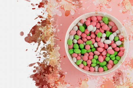 Sweet Dragee in a white bowl. Peanuts covered with sugar glaze. Treats. Digital watercolor painting