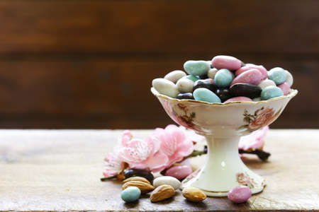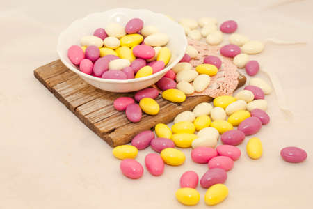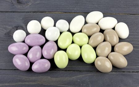 sugared almonds on a wooden surface