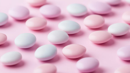 Small pastel candies in shades of pink and white are arranged on a light pink surface creating a visually appealing candy display for decoration.