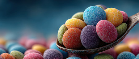 A vintage spoon holds an assortment of vibrant sugary candy in various colors set against a softly blurred background.