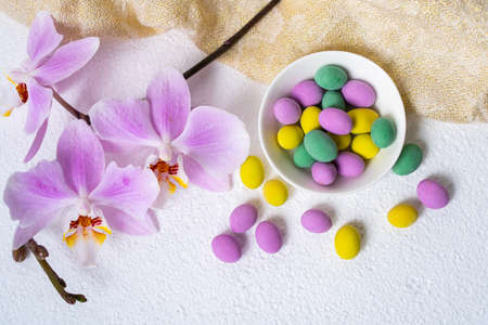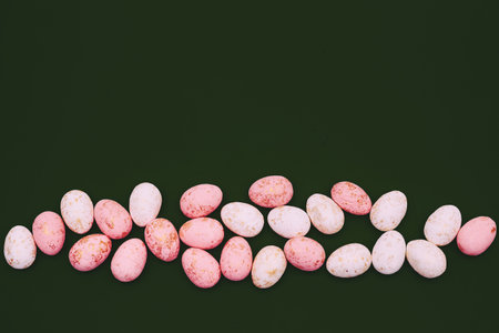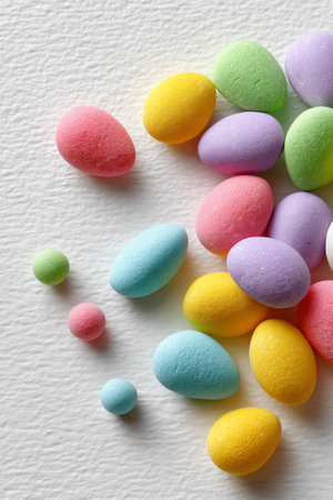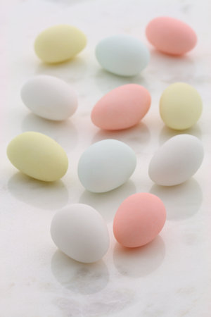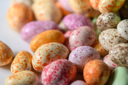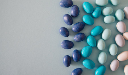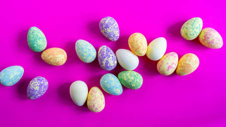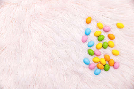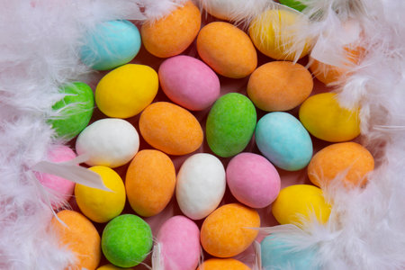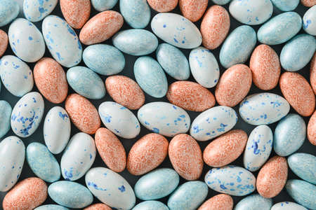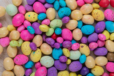 Assorted colorful chocolote eggs. Top view. jelly sweets
