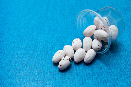 Candy egg white with brown spots and fall from the overflowing cup of transparent plastic.