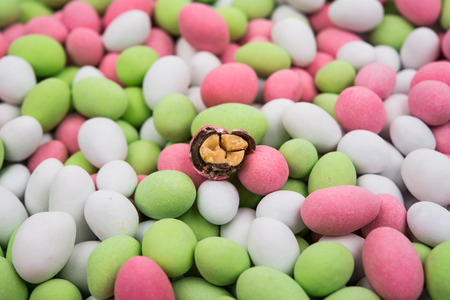 Almond candy in the form of a heap. Sugar coated on the outside, almond on the inside. close up