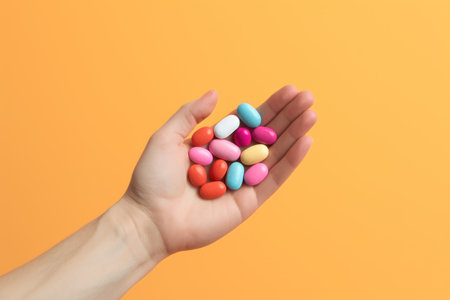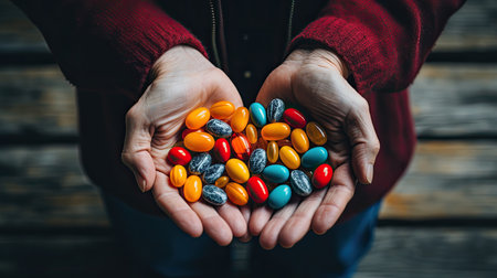 Close up hands showing prescription pills or medical pills or capsules. Generative AI