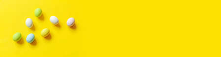 Happy Easter concept. Preparation for holiday. Easter candy chocolate eggs colorful pastel sweets and bunny toy isolated on yellow background. Simple minimalism flat lay top view copy space banner