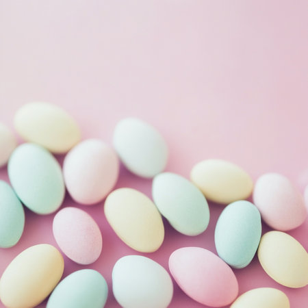 Colorful pastel Easter eggs scattered on textured background create a festive atmosphere. Soft hues of pink, blue, yellow, and purple evoke spring joys.