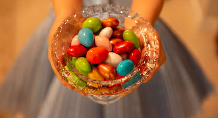 Colorful candies in the woman's hands. Handful candies on candy background. Eid Mubarak. Eid al fitr (Ramadan eid) background photo.