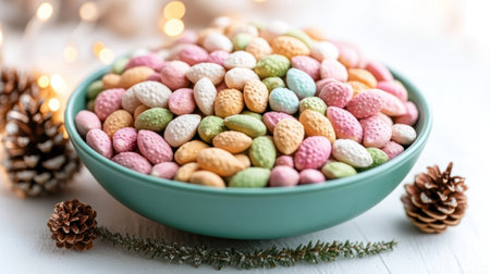 Pastel colored candy fills a green bowl surrounded by pinecones and twinkling lights