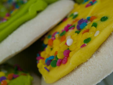 Colorful sugar cookies with sprinkles on a wooden background. Selective focus.