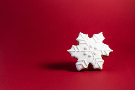 gingerbread cookie of snowflake on red background. Traditional Christmas food. Christmas and New Year holiday concept