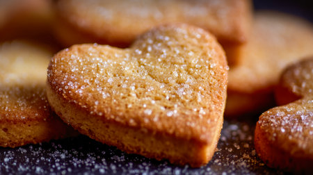 Delicate heart-shaped cookies rest on a dark background, their soft, crumbly surfaces highlighted by a glossy sugar dusting and warm, inviting golden edges.