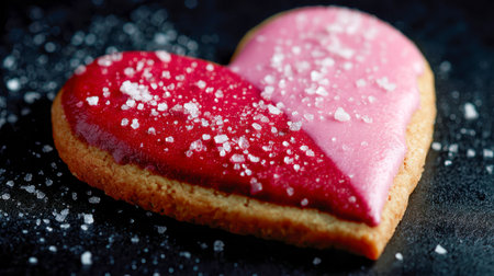 A sweet, personal treat featuring a love-inspired shape glazed in lively red and pink hues, accented with crunchy sugar granules against a rich, textured backdrop.