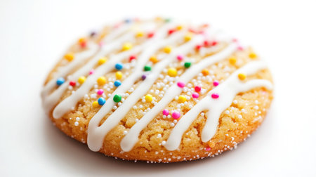 A close-up of a cookie with a drizzle of icing and colorful sprinkles, set against a white background to emphasize the decorative and sweet elements.