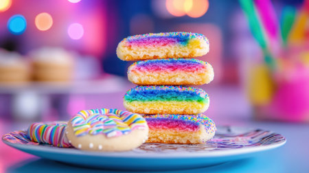Delicious rainbow cookies and striped wafers, stacked on a patterned plate with bright lighting