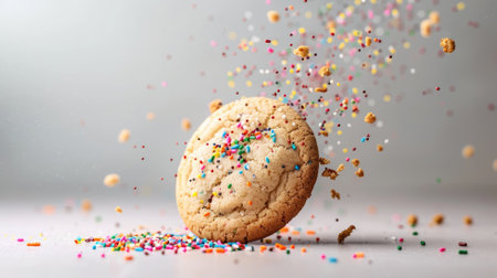 Cookie with colorful sprinkles falling around on white surface