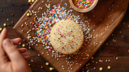 Cookie on wooden board with colorful sprinkles scattered around