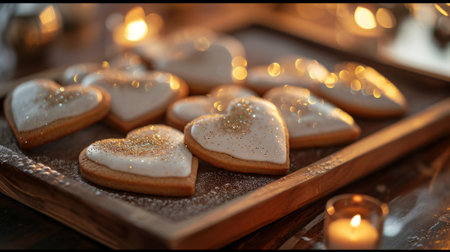 Glazed heart-shaped cookies with a dusting of edible glitter generative ai