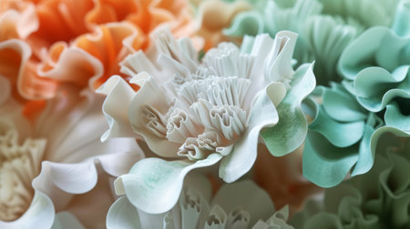 The flowers, reminiscent of sculpture. In pastel pink and blue tones. Abstract trendy background. Generative AI.