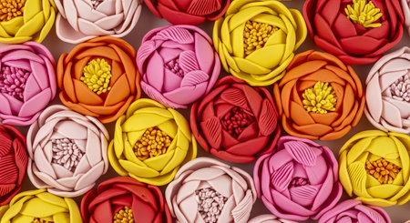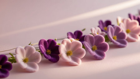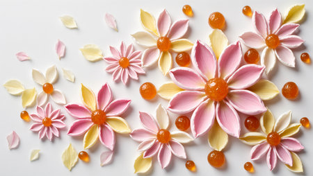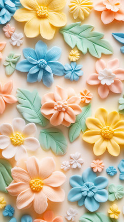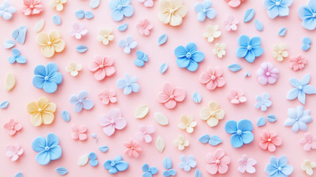 Floral pattern featuring delicate flowers made of polymer clay in pastel colors. Light background. Generative AI.