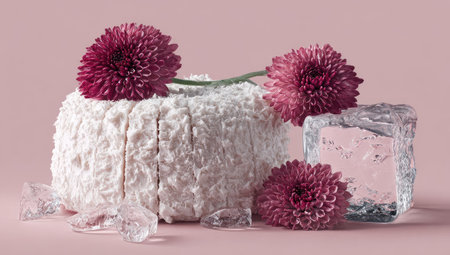 This image presents a delicate composition featuring vibrant magenta flowers alongside clear ice cubes, set against a pastel pink backdrop. The arrangement showcases textures of rough and smooth surfaces. The lighting suggests a soft, diffused ambiance suitable for various design projects, including advertisements and editorial content.
