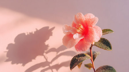 A single pink flower adorned with morning dew droplets glows in soft light.
