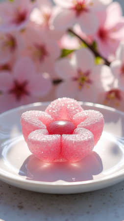 Pink floral wagashi on white plate with cherry blossom background. That the image is generated using AI.