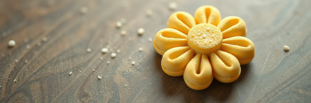 Flower-shaped cookie decorated with sugar placed on a wooden table with flour scattered around