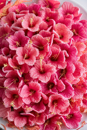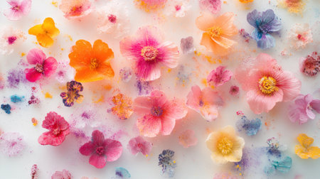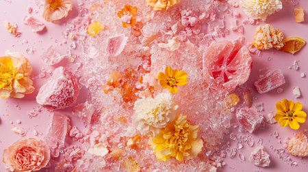 A top view of frozen flowers and crushed ice on a pink background, creating a refreshing and artistic composition with contrasting textures.