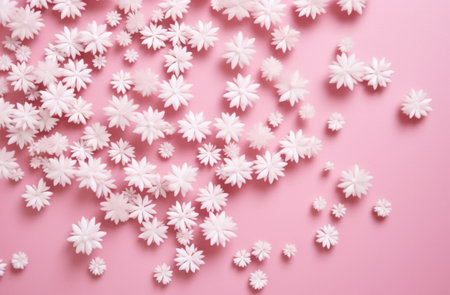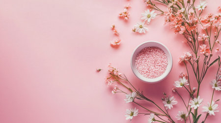 Delicate white and pink flowers arranged around a bowl of pink granules on a pastel pink background, emphasizing softness and femininity.