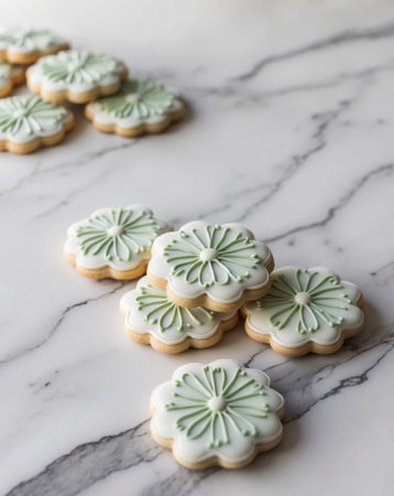AI Generated. Decorative green and white cookies with floral designs displayed on a marble surface