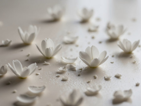 AI Generated. Delicate White Flower Petals on Smooth Textured Surface