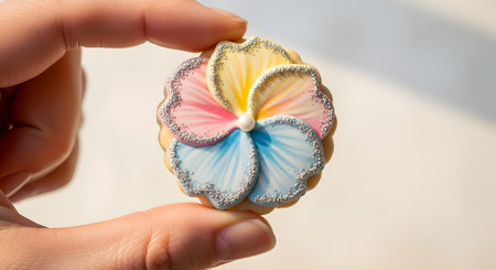 A person's hand holds a small, delicate sugar cookie shaped like a flower with six petals. The cookie is beautifully decorated with pastel pink, yellow, and blue icing and silver edible glitter.