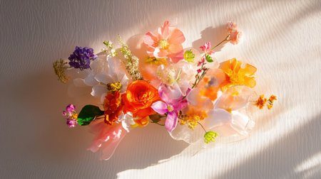 A vibrant and colorful floral arrangement featuring a variety of flowers, captured with soft light and gentle shadows, perfect for art and decoration.