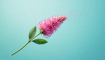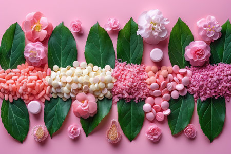 A flatlay featuring pink flowers pills and leaves arranged on a pink background