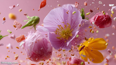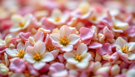 an abstract macro background of a flower blossom potpourri, captured at fifty megapixels. the image showcases delicate petals and textures in soft pinks, creams, and lavenders, with intricate details and shallow depth of field, creating a dreamy, organic aesthetic
