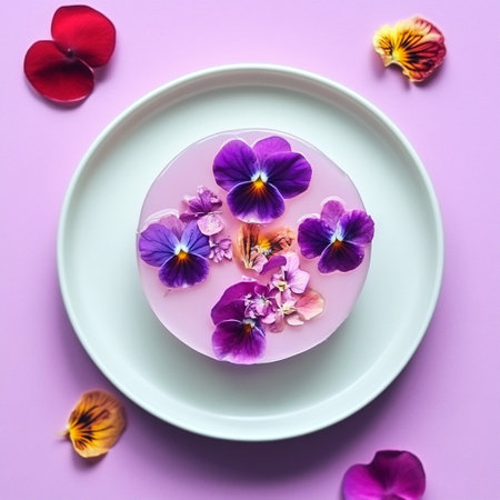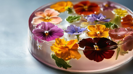 A whimsical dessert features a translucent jelly filled with a variety of edible flowers, displaying bright colors. This delightful treat is perfect for any special occasion or gathering.