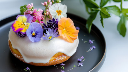 A stunning doughnut topped with a smooth icing and an array of vivid edible flowers, beautifully arranged on a sleek plate, perfect for springtime celebrations.