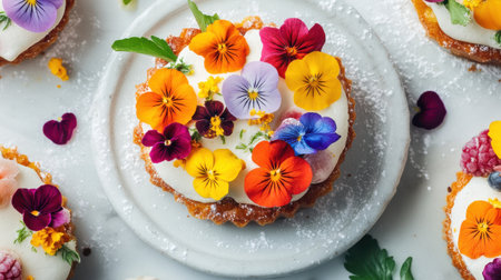 Delightful mini cakes are artfully decorated with an assortment of vibrant edible flowers, showing spring's beauty in a baking competition. The scene is cheerful and colorful.
