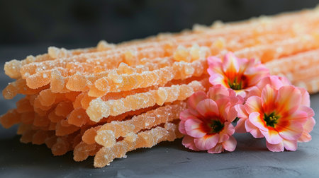 flowers and homemade Zephyr on a light background close-up, the concept of a holiday and unusual beautiful handmade gifts